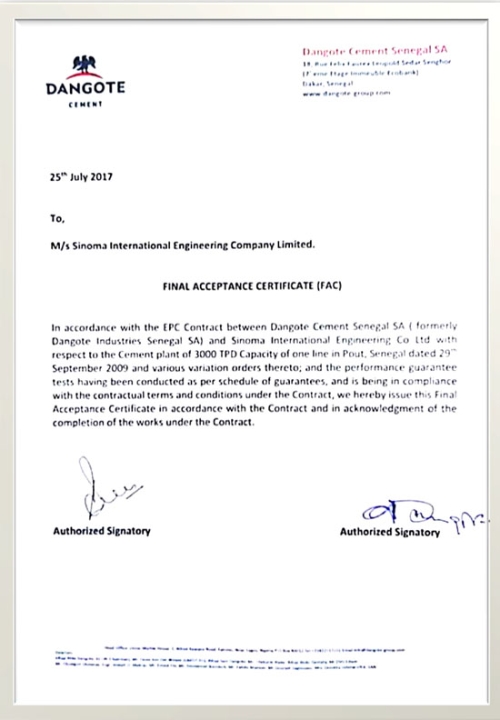 塞内加尔项目FAC证书的取得,是公司与Dangote集团合作的又一重要成果,也为Dangote其余项目FAC的申请夯实了坚实的基础。