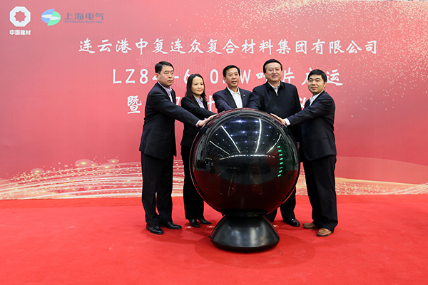 2018年12月27日,中复连众集团在连云港举行LZ84-6.0MW叶片启运暨B75叶片下线仪式。中国建材集团副董事长李新华,连云港市人民政府副市长徐家保,上海电气风电集团总裁谢雪琼,中国复材集团党委书记、董事长、总经理刘标,连云港经济技术开发区党工委副书记、常务副主任胡传宏共同启动水晶球,见证这一历史时刻。