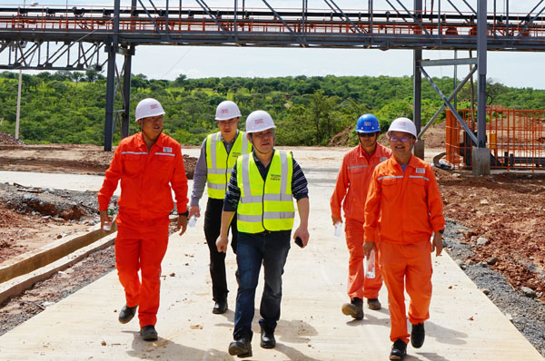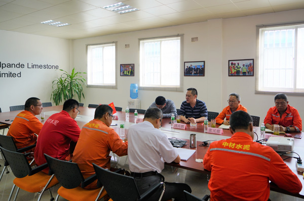 满高鹏抵达建设现场后,在中材水泥副总经理、中材Mpande公司董事长张元慈的陪同下,对项目现场建设情况进行实地检查,在员工食堂及宿舍建设工地、原料堆棚、中控室、化验室、堆取料库等水泥线建设现场、烧结砖骨料线项目、矿山破碎及首采区等建设现场,他一边听取介绍,一边就项目建设情况提出具体的建议和要求。在园区会议室,满高鹏听取了项目建设、试生产准备、市场调研等情况的专项汇报在听取汇报后,满高鹏高度肯定项目的快速推进和所取得的成绩,以及对参与园区建设的全体员工不辞辛劳的精神表示感谢。在谈到园区建设和生产准备工作时,满高鹏着重提出四点要求。一要确保安全。要严格贯彻“安全效益优先”的管理理念,工期和试生产等各项工作要在确保安全的前提下稳步推进,充分考虑到目前项目现场交叉作业的复杂性,加强现场安全管理和隐患排查,健全专职安全管理队伍,同时结合赞比亚项目具体实际,做好赞比亚籍员工安全理论培训和安全理念灌输的常态化。二要做好营销。工业园的产品品种多,营销难度大,因此要广开思路,加快营销团队建设,创新营销模式,研究透赞比亚市场,高起点开展产品营销推广,突出自身优势,培养客户忠诚度,提高产品美誉度。三要做好试生产准备。集中资源解决外供电工作的难点,在单机试车、联动试车以及带负荷试车中要完善预案,注重细节,确保各项工作做细、做实。做好中赞员工尤其是赞籍人员的招聘及管理工作。四是在数字化、智能化管理上有创新。充分利用园区项目的高起点优势,因地制宜开展数字化、智能化管理的试点工作,为减少用工人数和降低劳动者工作强度夯实基础。他最后强调,中国建材赞比亚工业园项目是中材水泥国际化战略的第一张名片,园区的各项工作得到集团领导的高度肯定,创造的很多记录为中材水泥增光添彩,希望能再接再厉,抓安全、抓质量、抓服务,促进各项工作全面发展。