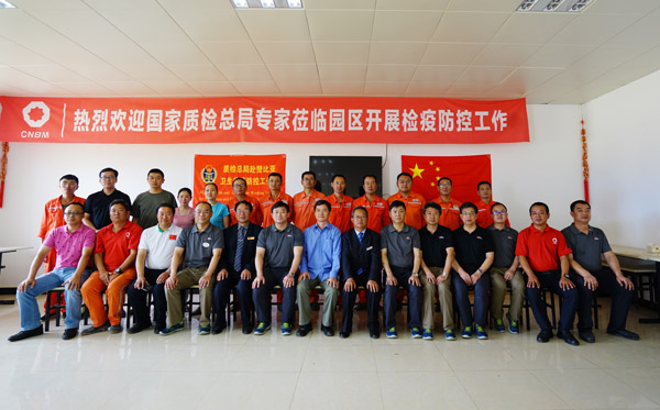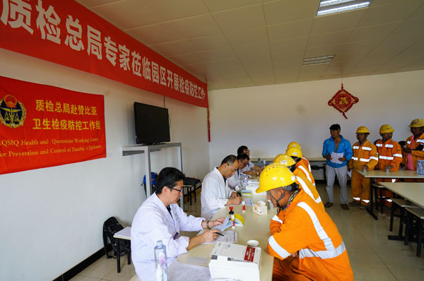 工作组专家抵达园区后,在听取中材水泥副总经理、中材Mpande公司董事长张元慈对园区的简单介绍后,立即为中方员工开展霍乱疫苗免费接种,疫苗接种对象为出境时没有服用疫苗或者服用疫苗已经超过有效期限的中方员工。中国援赞第19批医疗队和中国援赞第21批军医组也派出医护人员在现场组成医疗应急保障组,确保员工安全服用疫苗。早早就等候在项目部的中方员工们排着整齐的队伍,秩序井然地参加疫苗接种,现场服务人员为他们做好表格登记、发放饮用水,专家们则耐心地询问疫苗服用情况,发放并现场服用疫苗,在《疫苗接种或预防措施国际证书》上签章,并为来赞时没有领取黄本证书的员工们直接在现场填写发放。工作组的专家还为员工开展疟疾、艾滋病等快速检测及身体体检。历时2个小时共发放霍乱疫苗142盒,现场填制发放证书31本。