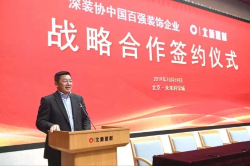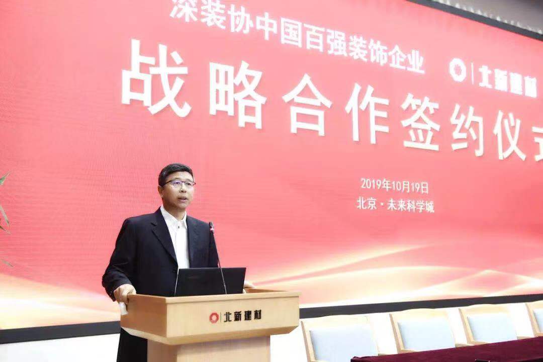 深装协高刚会长在签约仪式上致辞。他说,在实地参观北新建材后,完全颠覆了对北新建材和建材企业的印象,北新建材的很多创新产品及创新管理体系都值得向全行业推广,提升质量、解决痛点、缩短工期、绿色环保,希望通过本次战略合作共同为客户创造价值。此前深装协已有13家优秀装饰企业与北新建材签署了战略合作协议。今天,深装协应行业发展形势顺势而为,再次引导并见证了26家深圳领军装饰企业与北新建材强强联合,体现出深装协团结一致的新面貌和寻求转型升级发展的决心。深装协作为中国现代装饰行业的发祥地、成长的摇篮、黄埔军校及战略储备基地,对中国现代装饰行业的发展做出了巨大贡献。北新建材是深装协副会长单位,既是行业建筑材料的主要供应者,也是行业高标准高质量的代表。希望未来深圳装饰行业企业与北新建材能够碰撞产生更大的聚合效应,开展更加深度全面的合作,为客户提供低成本、高品质服务,为满足人民群众日益增长的美好生活需要做出更大贡献。