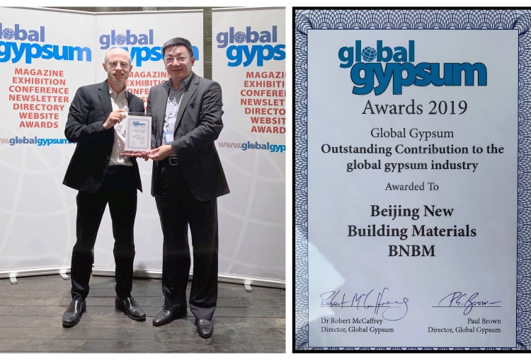 10月24日,在马来西亚吉隆坡召开的第19届全球石膏大会上,经过全球石膏行业投票评选和全球石膏协会专家评选,北新建材被授予唯一的“全球石膏工业突出贡献奖”。全球石膏协会主席Robert向北新建材董事长王兵颁发了“全球石膏工业突出贡献奖”。