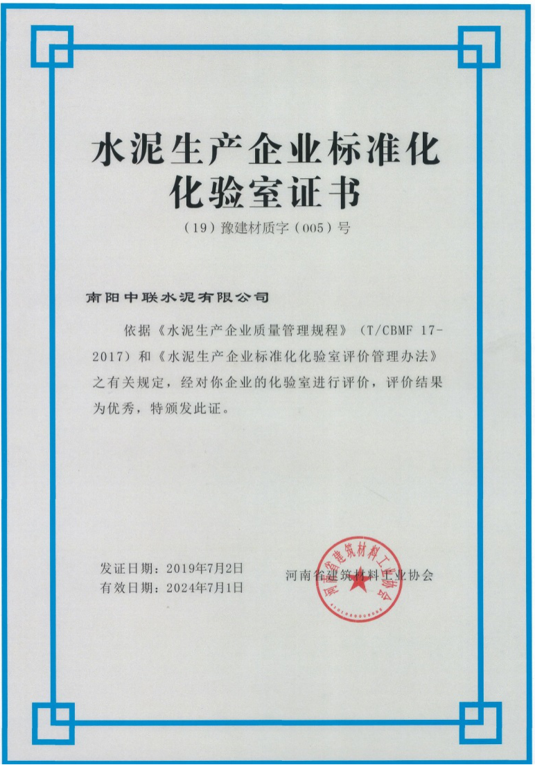 近日,南阳中联化验室被河南省建筑材料工业协会评为水泥生产企业优秀标准化化验室。