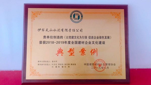2019年9月5日,伊犁天山收到了中国建筑材料企业管理协会送来的获奖奖牌、证书以及“2018~2019年度全国建材企业文化建设典范、突出贡献人物、示范基地”的通知文件,并在《第五届全国建材企业文化年会》上对伊犁天山的“以党建文化为引领 促进企业绿色发展”企业文化成果进行刊登宣传。