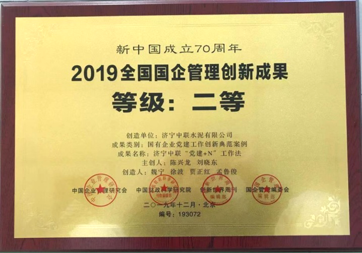 2019(第四届)国企管理年会暨(第五届)国企管理·财务管理创新峰会于12月28日在北京召开。会上发布了2019年全国国企管理创新成果获奖名单,《济宁中联“党建+N”工作法》荣获“2019全国国企管理创新成果”奖。