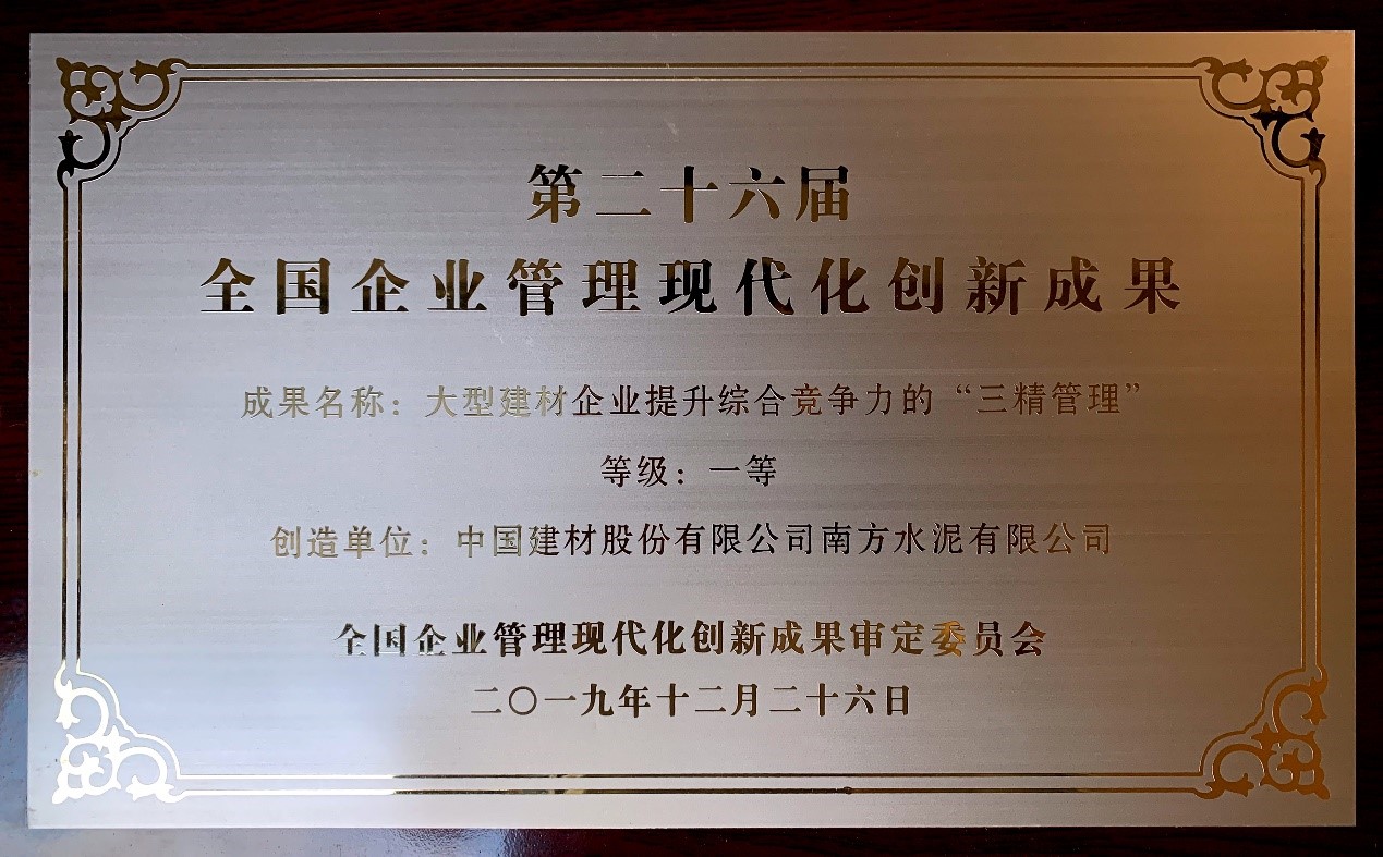 10月22日,由中国企业联合会主办的2020年全国企业管理创新大会在河南焦作召开。会上,全国企业管理现代化创新成果审定委员会发布了第二十六届全国企业管理现代化创新成果,中国建材集团推荐南方水泥有限公司申报的《大型建材企业提升综合竞争力的“三精管理”》获得一等奖。这是南方水泥继2010年以《水泥企业区域性大规模的重组整合》获得第十七届国家级管理创新一等奖后再度获此殊荣。