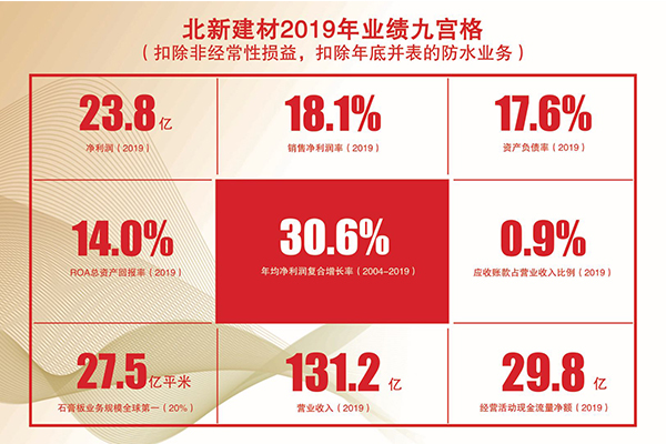 2004-2019年,北新建材实现年均净利润复合增长率30%(剔除非经常性损益),2019年总资产回报率(ROA)14%,销售净利润率18%,资产负债率32%。经国务院批准荣获中国工业大奖,实现建材行业零的突破。荣获全国质量奖,被全球权威评级机构穆迪授予A3评级,是全球同行业最高评级。