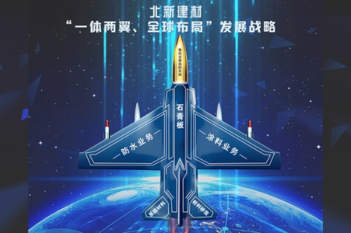 2019年,北新建材确立“一体两翼、全球布局”发展战略,“一体”就是以石膏板业务为核心,做好轻钢龙骨、粉料砂浆、矿棉板、保温材料、纤维水泥板等“石膏板+”配套延伸业务,推广全球原创的“鲁班”万能板全屋装配系统,为客户提供“内墙外墙吊顶地面”一揽子创新产品技术解决方案;“两翼”就是发展防水材料和涂料业务,进入“十倍+”市场,培育战略级主营业务;“全球布局”就是以石膏板为龙头产品,逐步开展全产品系列全球布局,打造世界级品牌。