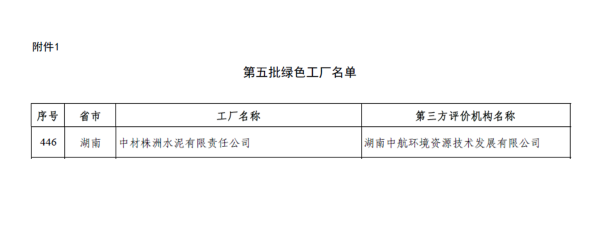 近期,在工业和信息化部公布的第五批绿色制造名单中,中材水泥有限责任公司成员企业——中材株洲水泥有限责任公司,被评为“国家级绿色工厂”。