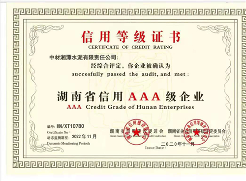 近日,中材湘潭顺利通过湖南信用建设促进会和湖南省企业信用等级评定委员会评审,荣获“湖南省信用AAA级企业”称号。湖南省信用AAA级企业由企业信用等级评定委员会组织专家对申请企业进行综合评审,评定通过后在湖南信用网公示无异议后向企业颁发证书,并对通过企业的质量信用实施动态监测。