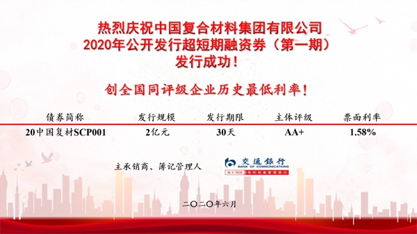 6月16日,中国复合材料集团有限公司成功发行2亿元超短期融资券,期限30天,票面利率1.58%,在债券市场创全国同评级企业历史最低利率!