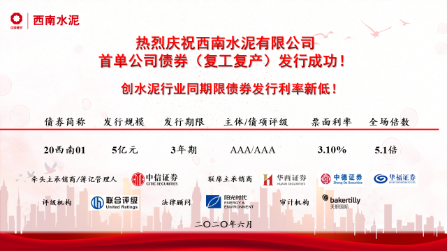 6月4日,西南水泥有限公司(以下简称“西南水泥”或“公司”)成功发行5亿元公司债券(复工复产),期限3年,票面利率3.10%。基于对公司战略、经营绩效和未来发展等的充分认可,投资者认购踊跃,全场倍数达5.1倍。西南水泥首单公司债券为中国建材股份有限公司所属企业同期限债券最低利率!创水泥行业同期限债券历史新低!