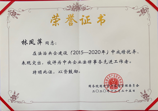 为总结法治央企建设经验、鼓励先进,进一步推进法治央企建设,2020年12月25日,国务院国有资产监督管理委员会印发《关于表彰中央企业优秀总法律顾问、优秀法律顾问和法律事务先进工作者的决定》,决定对中央企业中的10名优秀总法律顾问、10名优秀法律顾问和279名法律事务先进工作者予以表彰。宁夏建材证券部部长林凤萍被评为“中央企业法律事务先进工作者”。