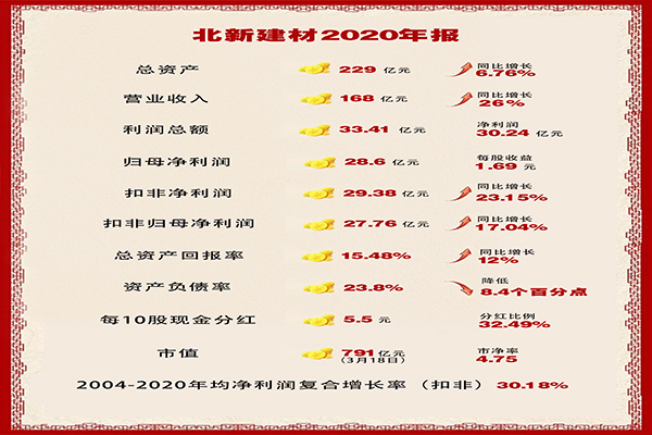 2004-2020年,北新建材实现年均净利润复合增长率30.18%(扣除非经常性损益),实现高质量经营和可持续发展。