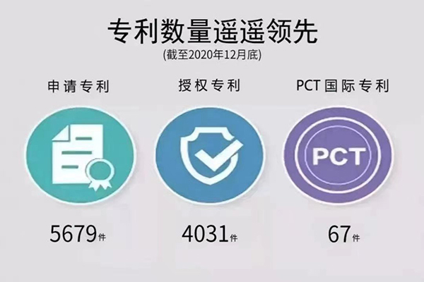 研发投入6.72亿元,同比增长59.58%,占营业收入比例增至4%。截至2020年底,累计申请专利5679件,授权专利4031件,申请国际PCT专利67件,授权国际PCT专利11件。