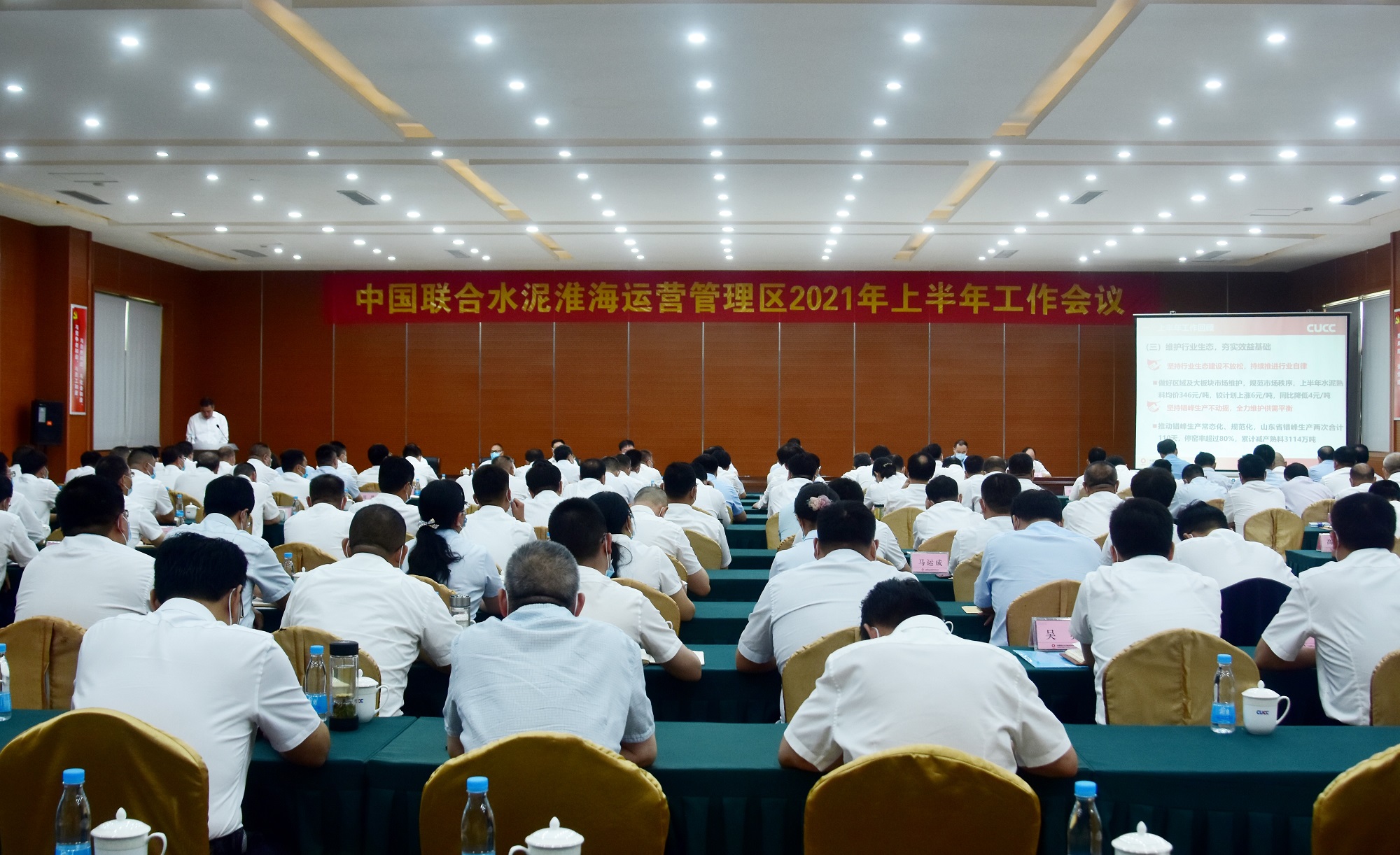 中国联合水泥行政总监赵绪礼,中国联合水泥运营总监、淮海区副总裁杜纪俊,淮海区领导班子成员、各中心(部)副总经理以上管理人员,各片区主任、营销副主任,各企业总经理、财务负责人等参加了会议。