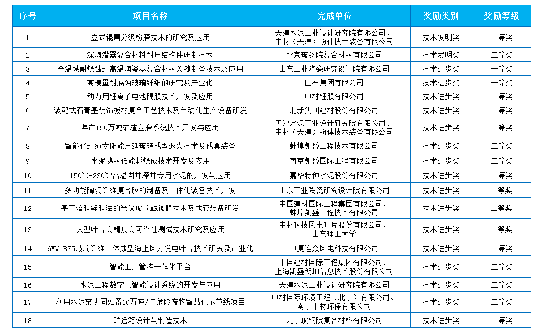 2021年中国建材股份有限公司及所属企业获中国建材集团科学技术奖项目名单