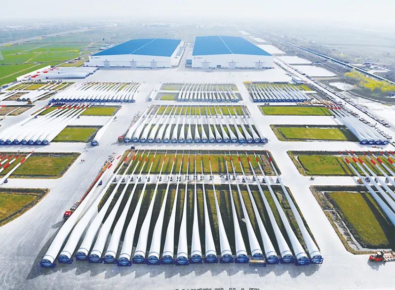 中国建材集团风电叶片年总产能19660兆瓦,产品覆盖1.0兆瓦到15.0兆瓦系列,拥有100余个型号,开发出112米海上风电叶片。图为中国建材集团风电叶片阜宁生产基地。