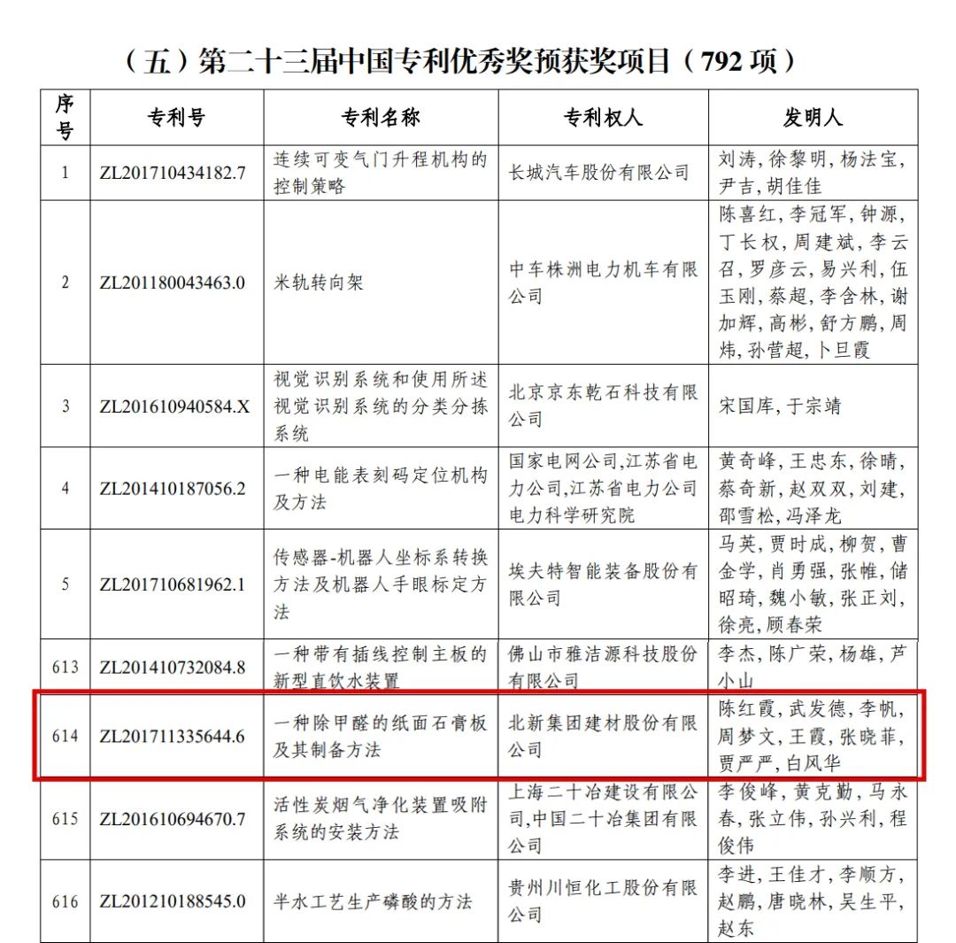 近日,第二十三届中国专利奖获奖名单出炉,中国建材股份有限公司所属巨石集团有限公司荣获中国专利金奖(专利名称:一种玻璃纤维组合物及其玻璃纤维和复合材料);北新集团建材股份有限公司获中国专利优秀奖(专利名称:一种除甲醛的纸面石膏板及其制备方法)。